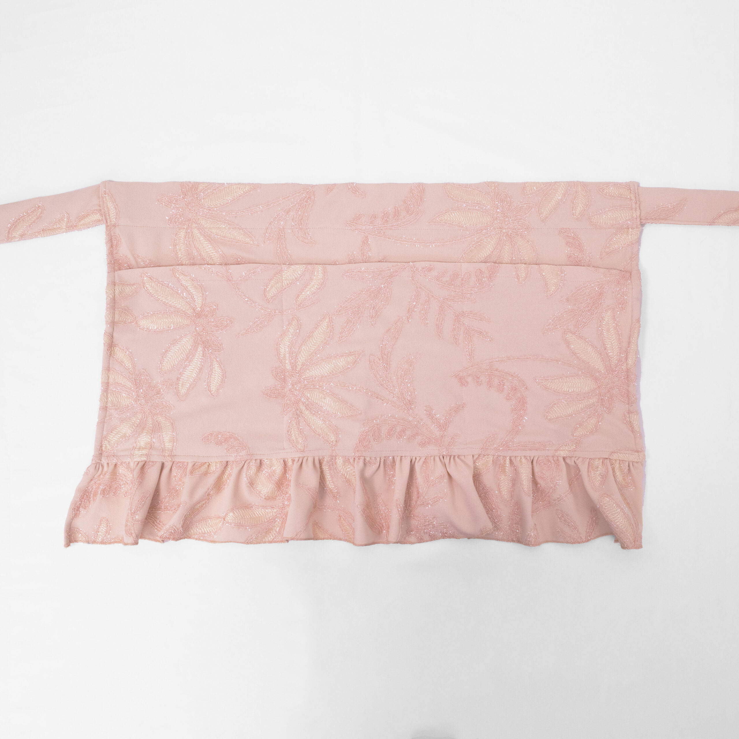 An apron made from a sturdy interlock stretch fabric with a beautiful shiny floral pattern. Perfect for working in the kitchen or just for entertaining.