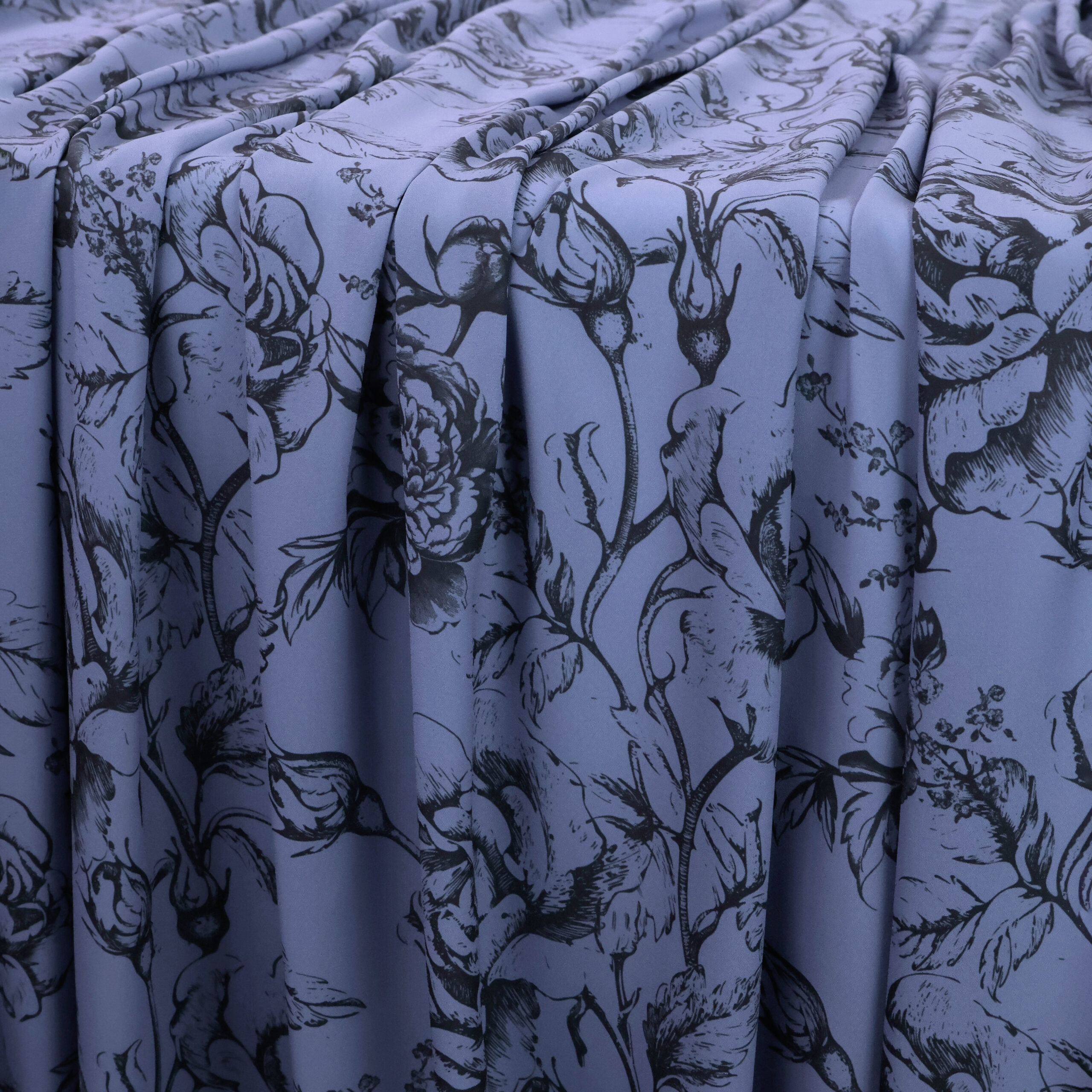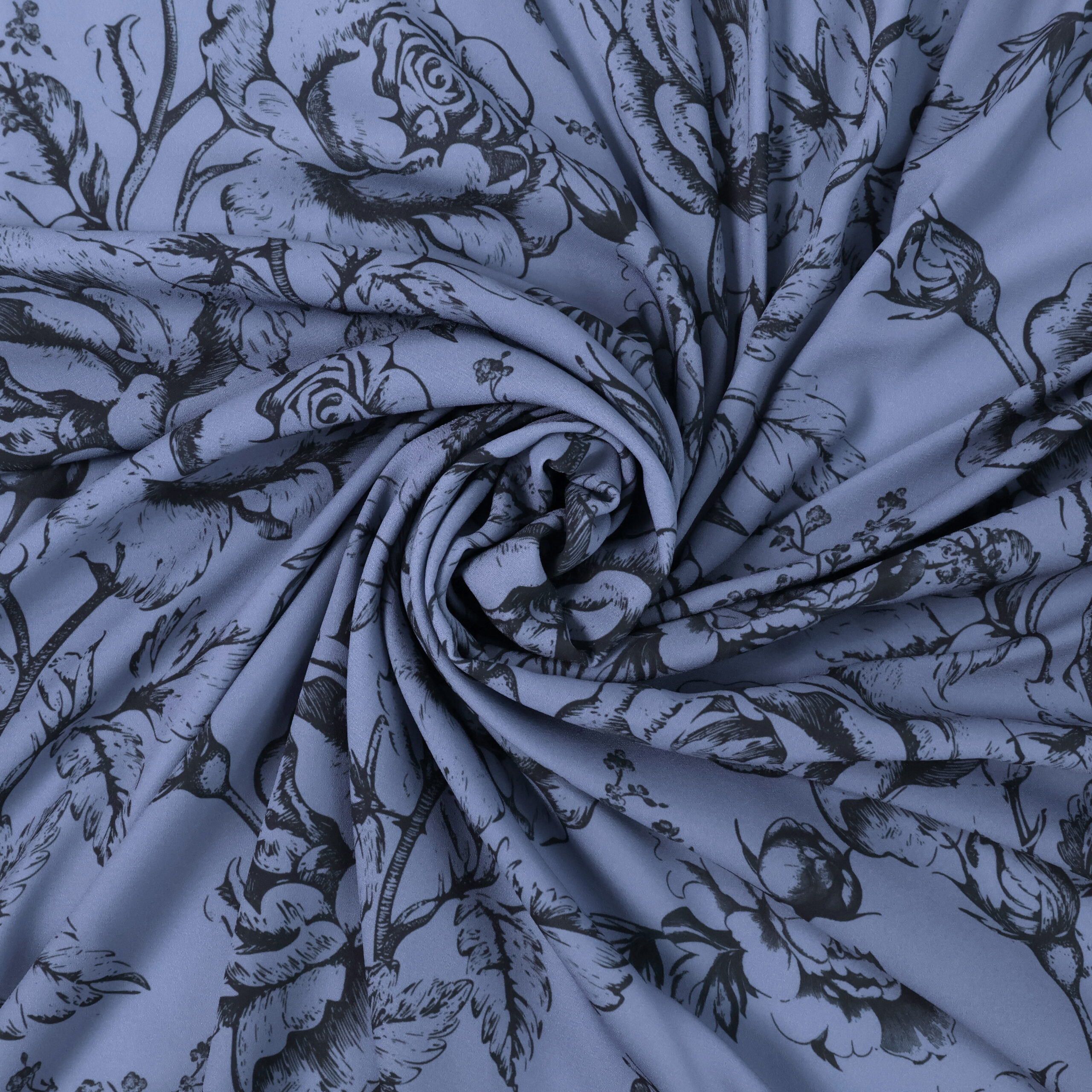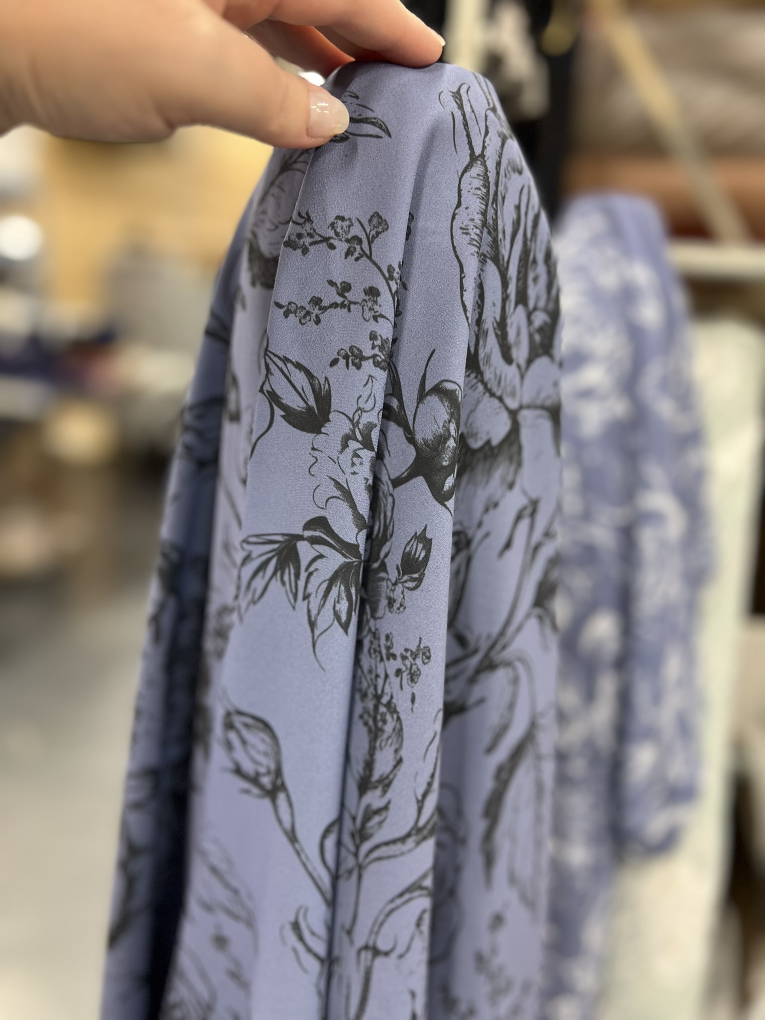 A beautiful floral print on a lightweight polyester fabric with an hyacinth blue background. The fabric has a beautiful fluid drape, perfect for dresses, blouses and skirts.