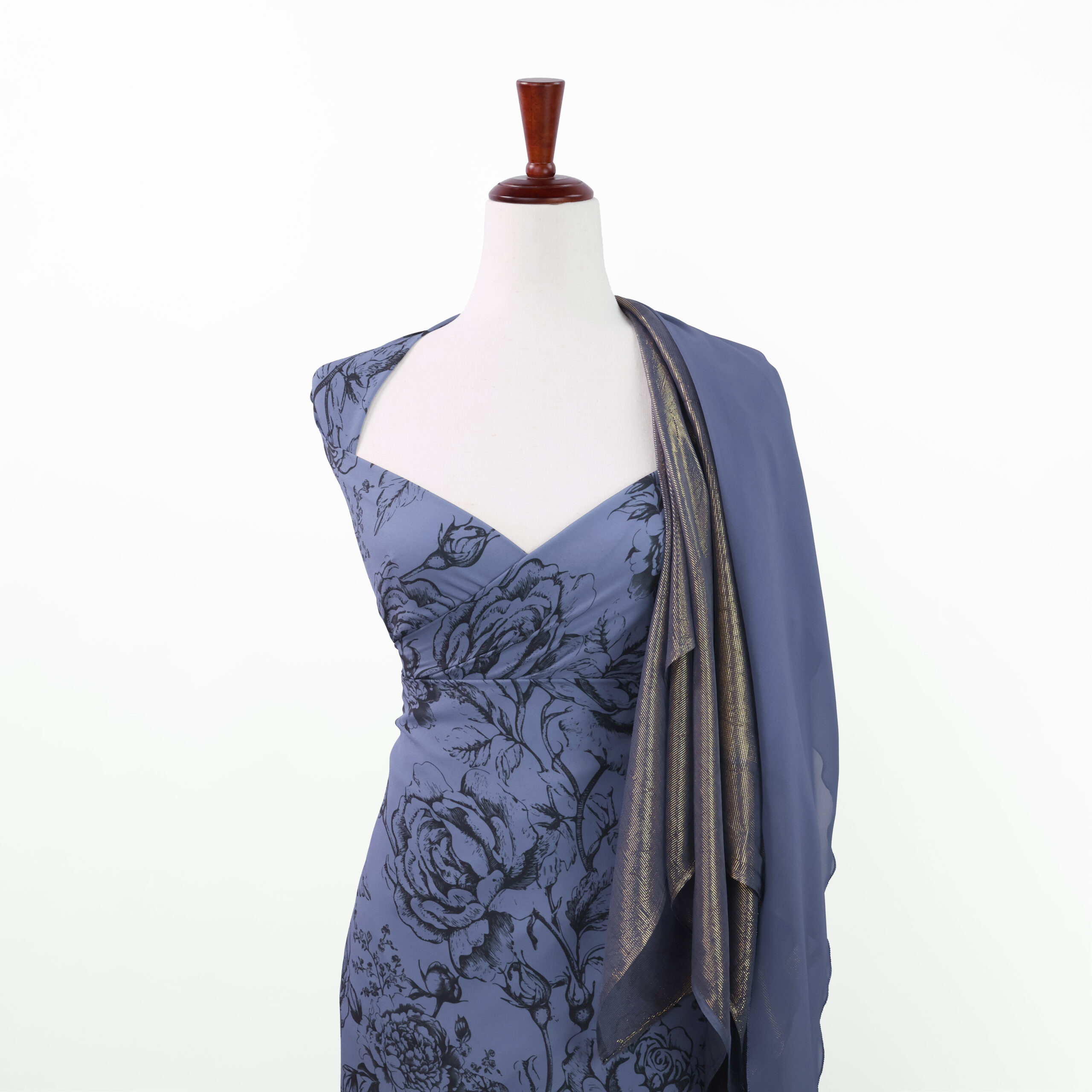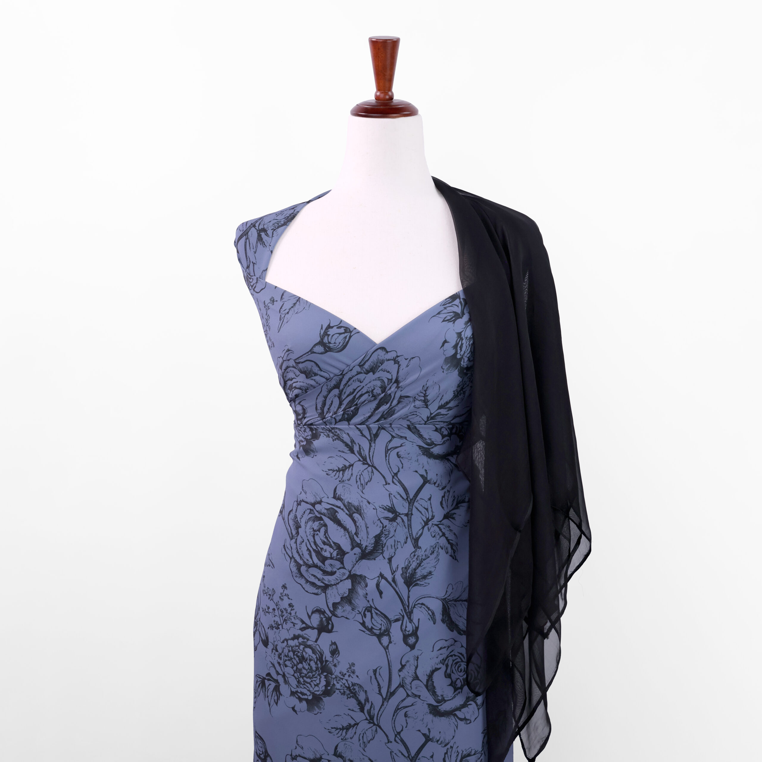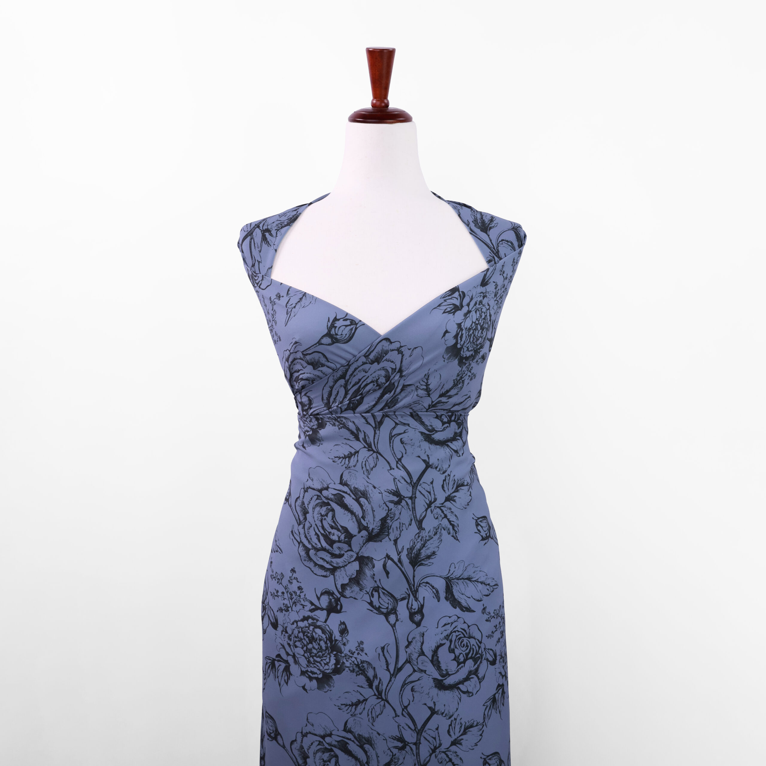 A beautiful floral print on a lightweight polyester fabric with an hyacinth blue background. The fabric has a beautiful fluid drape, perfect for dresses, blouses and skirts.