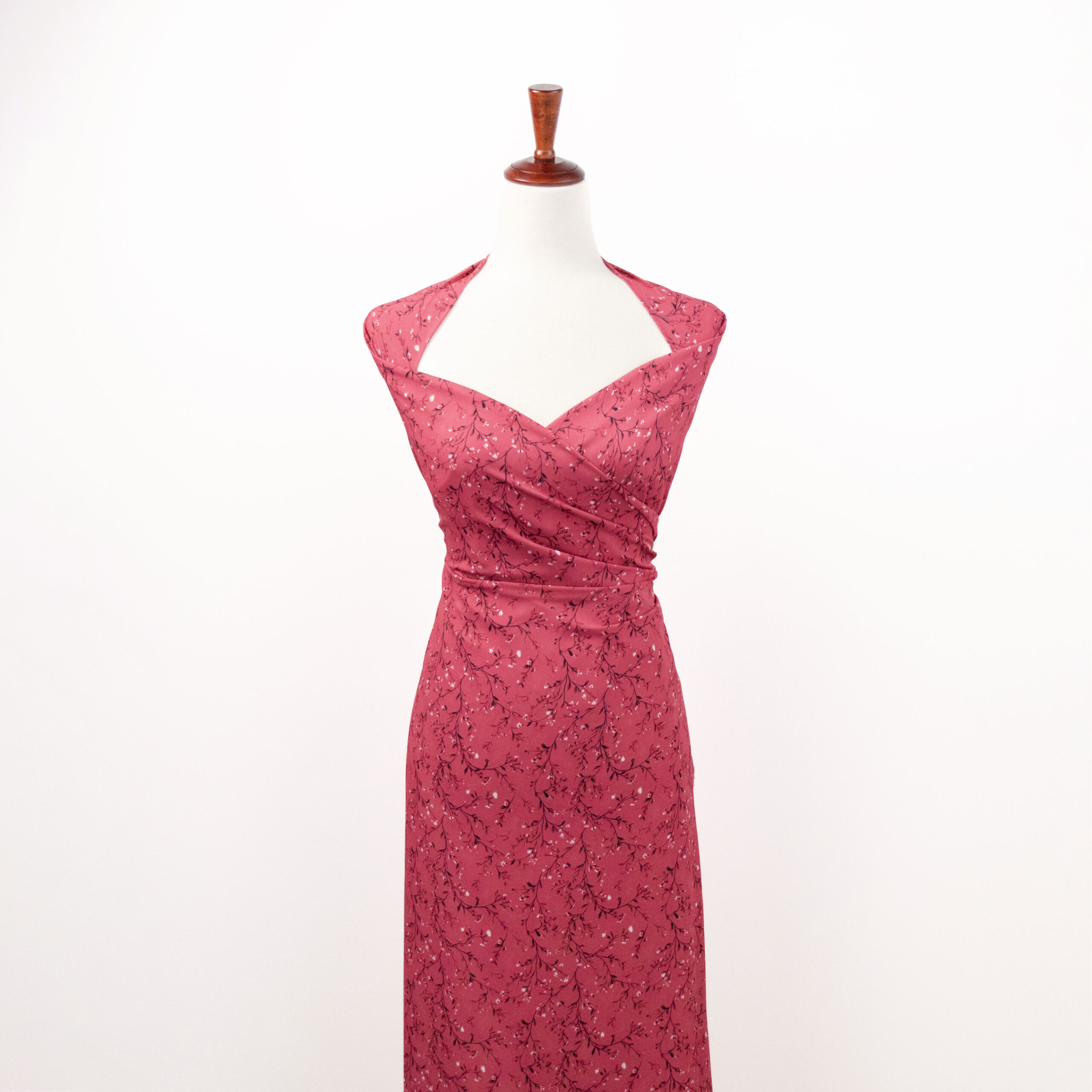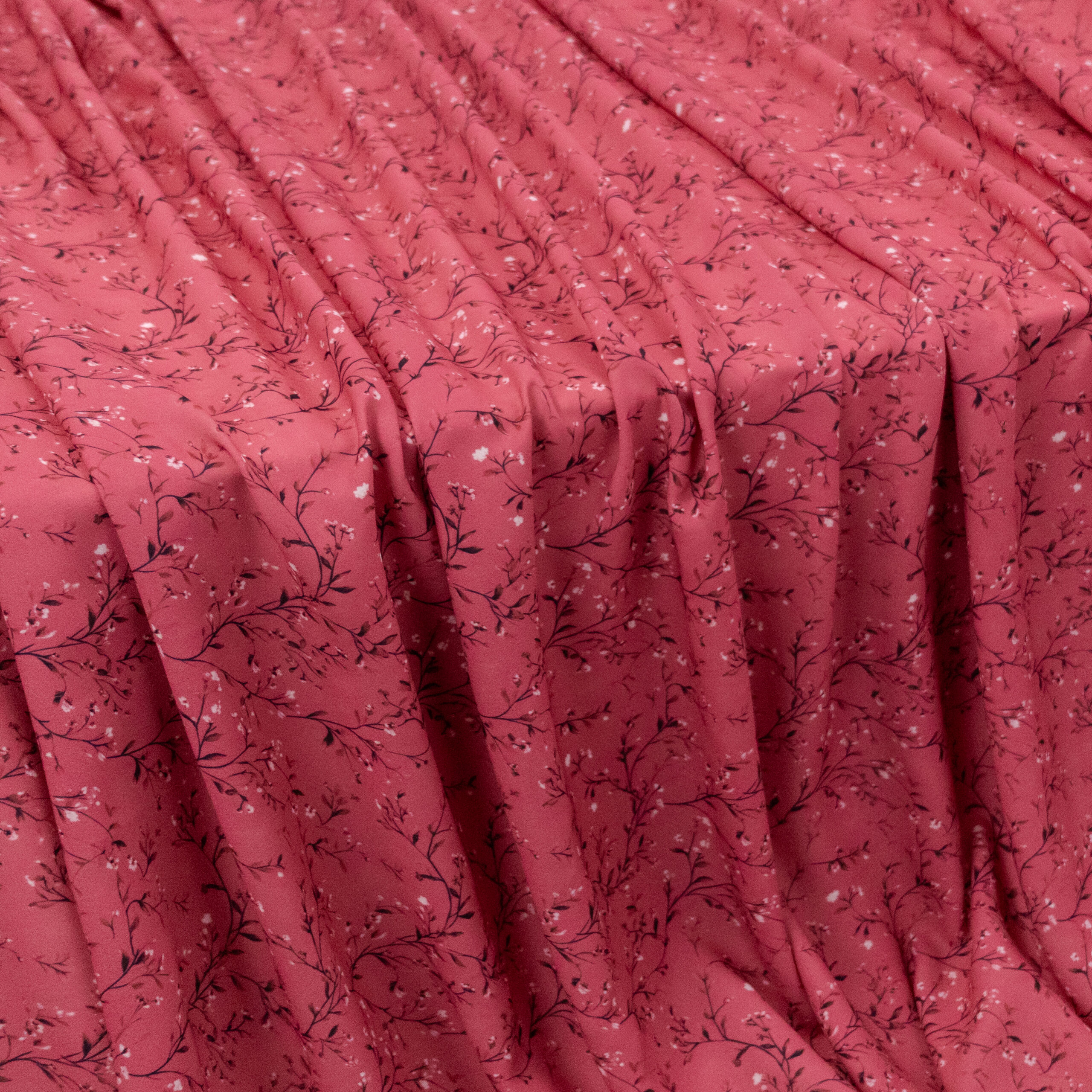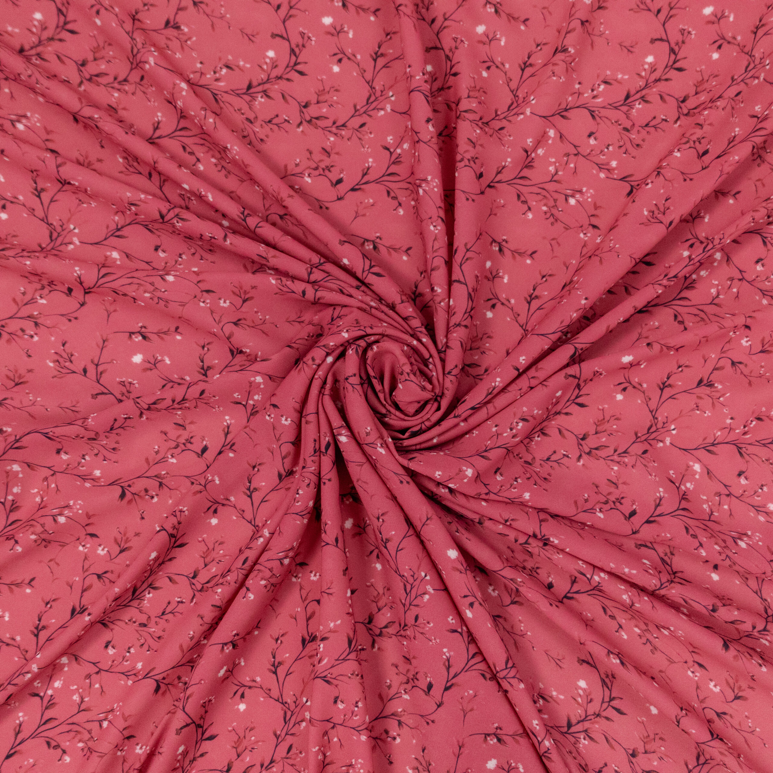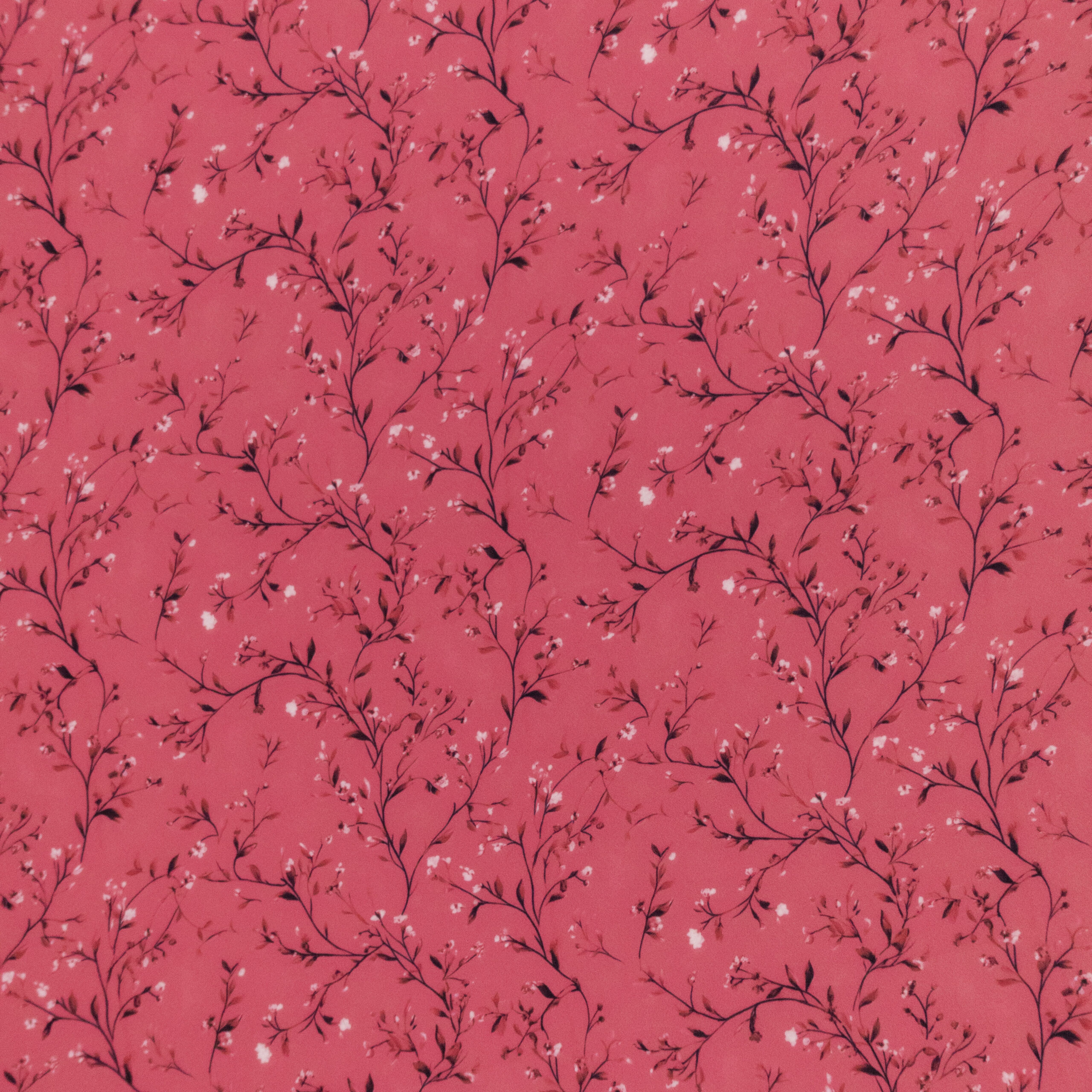 A beautiful pink floral vine print on a lightweight polyester fabric. The fabric has a beautiful fluid drape, perfect for dresses, blouses and skirts.