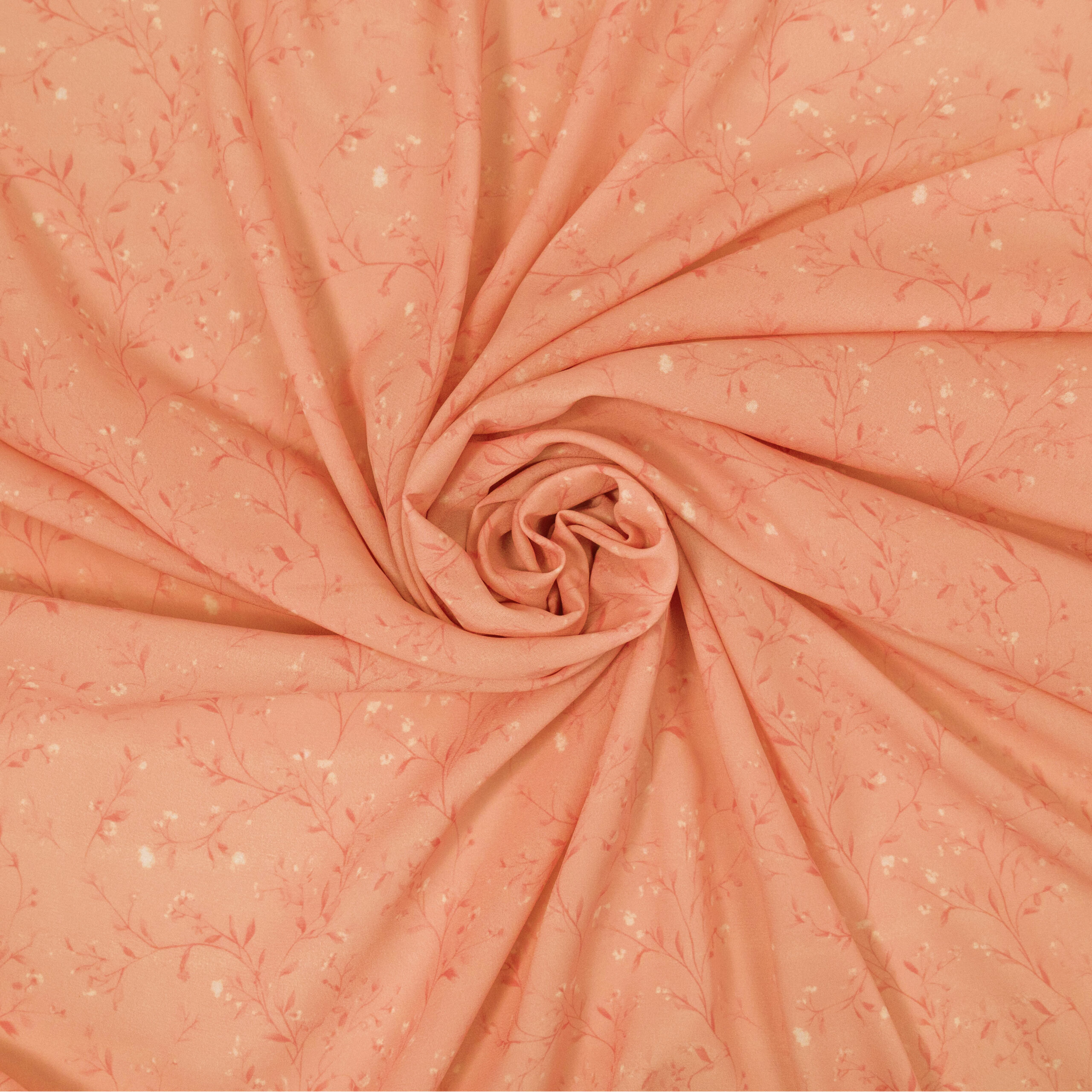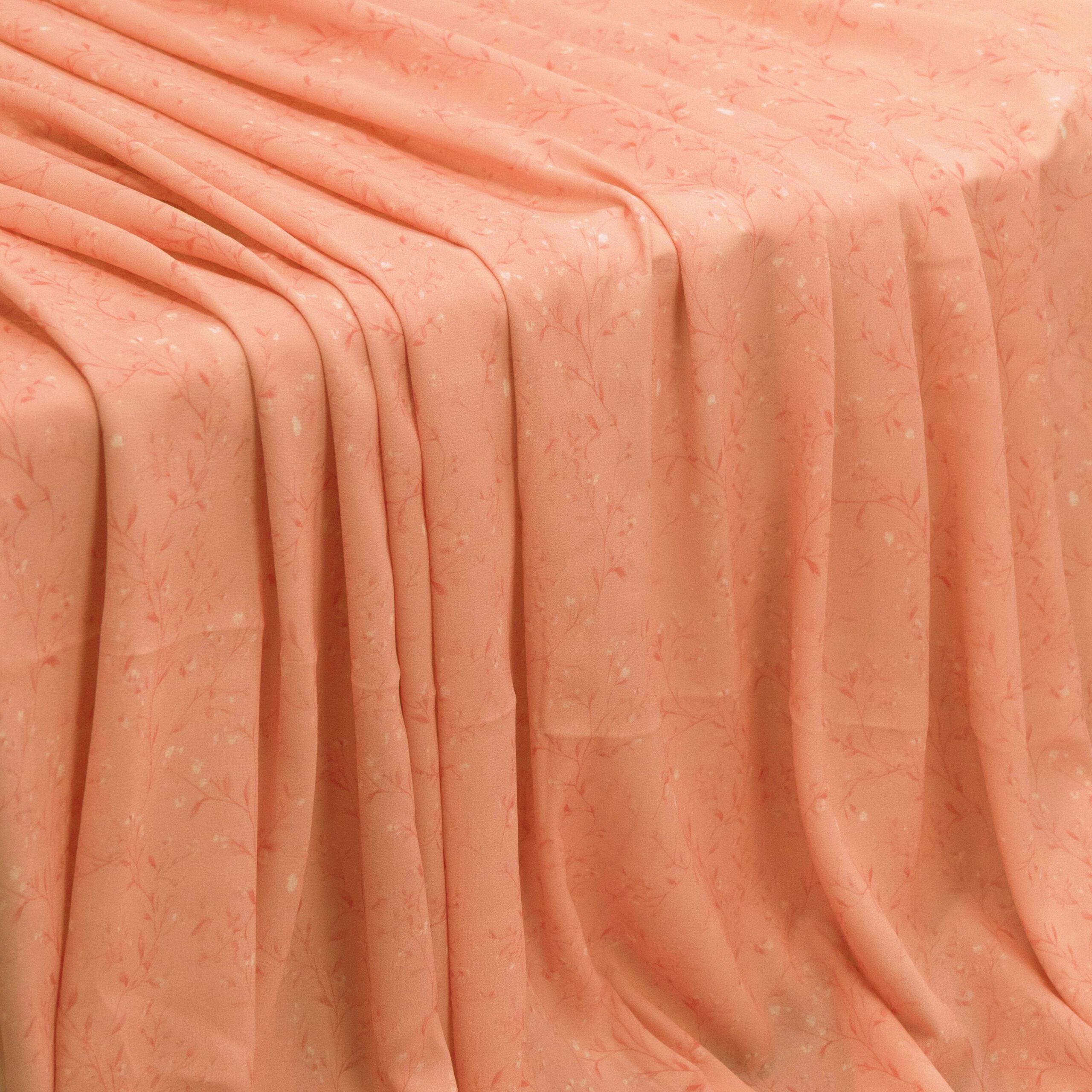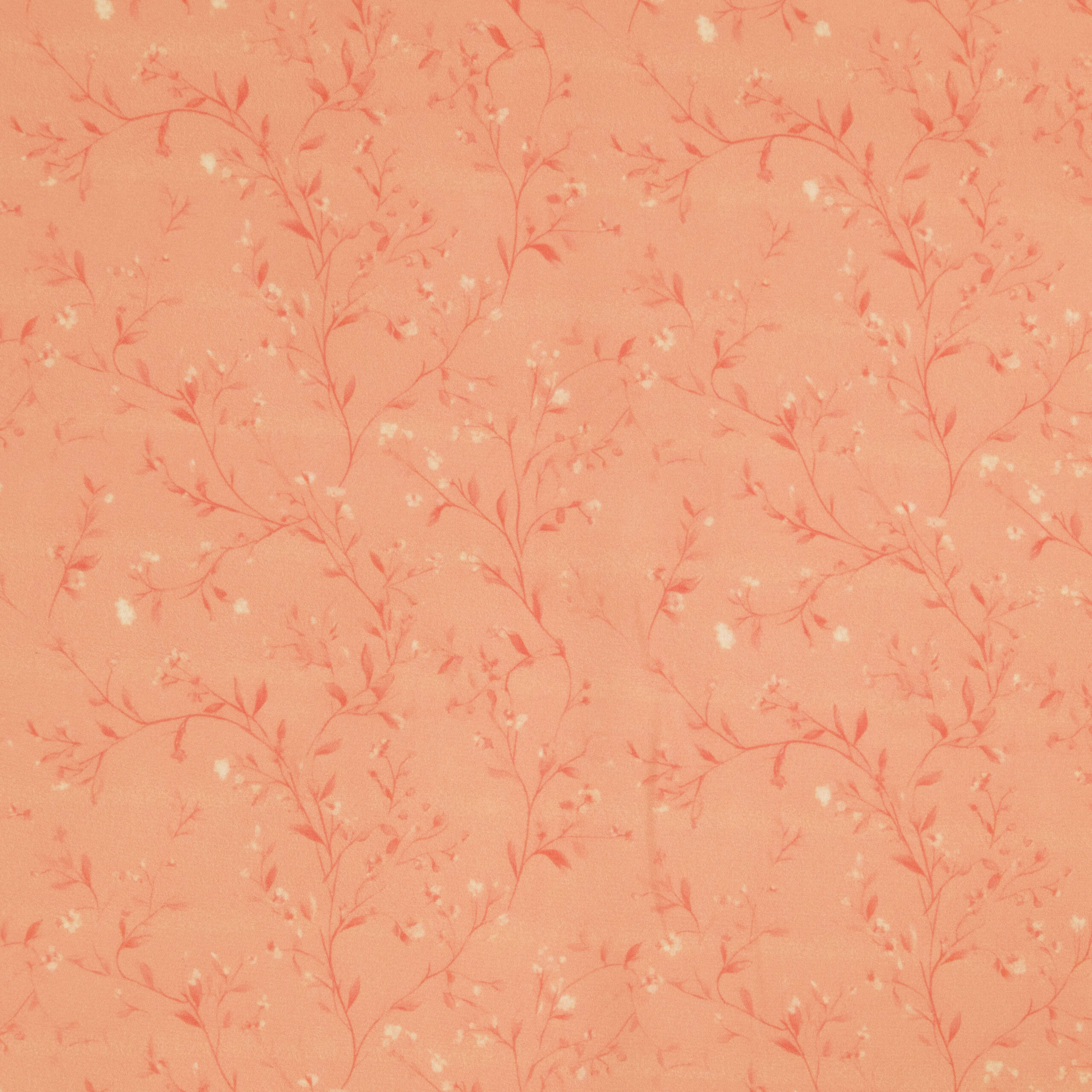 A beautiful coral floral vine print on a lightweight polyester fabric. The fabric has a beautiful fluid drape, perfect for dresses, blouses and skirts.